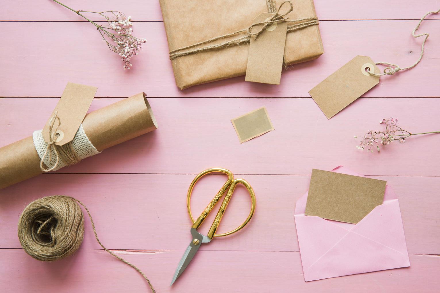 חומרי יצירה ועטיפת מתנות בעבודת יד על שולחן ורוד